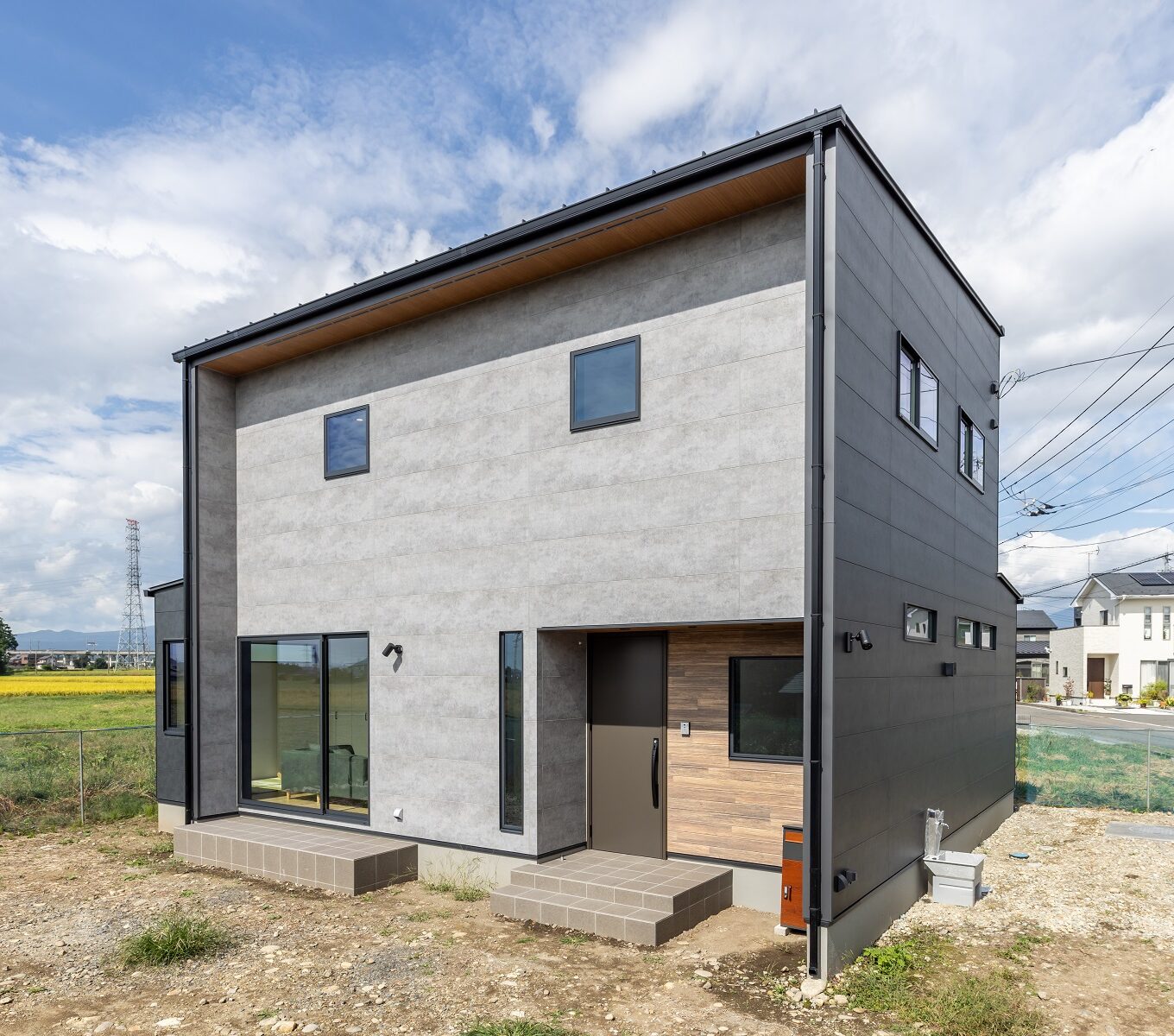 濃淡の違うグレーとアクセントの木目が美しいサイディングの外観が目を引く物件。 緑豊かな周辺風景に溶け込みつつも、印象的な見た目となりました。
